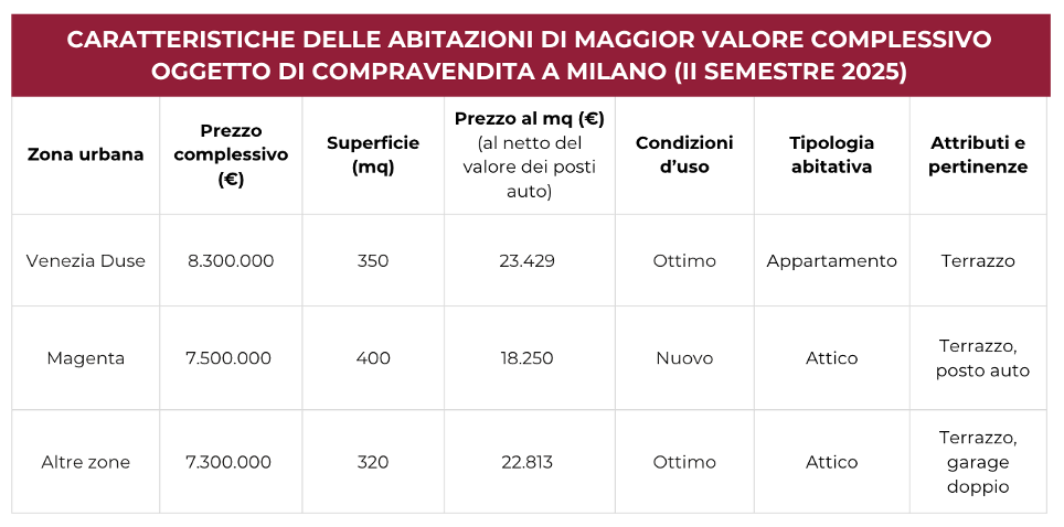 Le tre operazioni più significative del periodo hanno generato un volume complessivo superiore a 23 milioni di euro, registrando prezzi al metro quadro nell'intervallo tra 18.000 e oltre 23.000 euro.